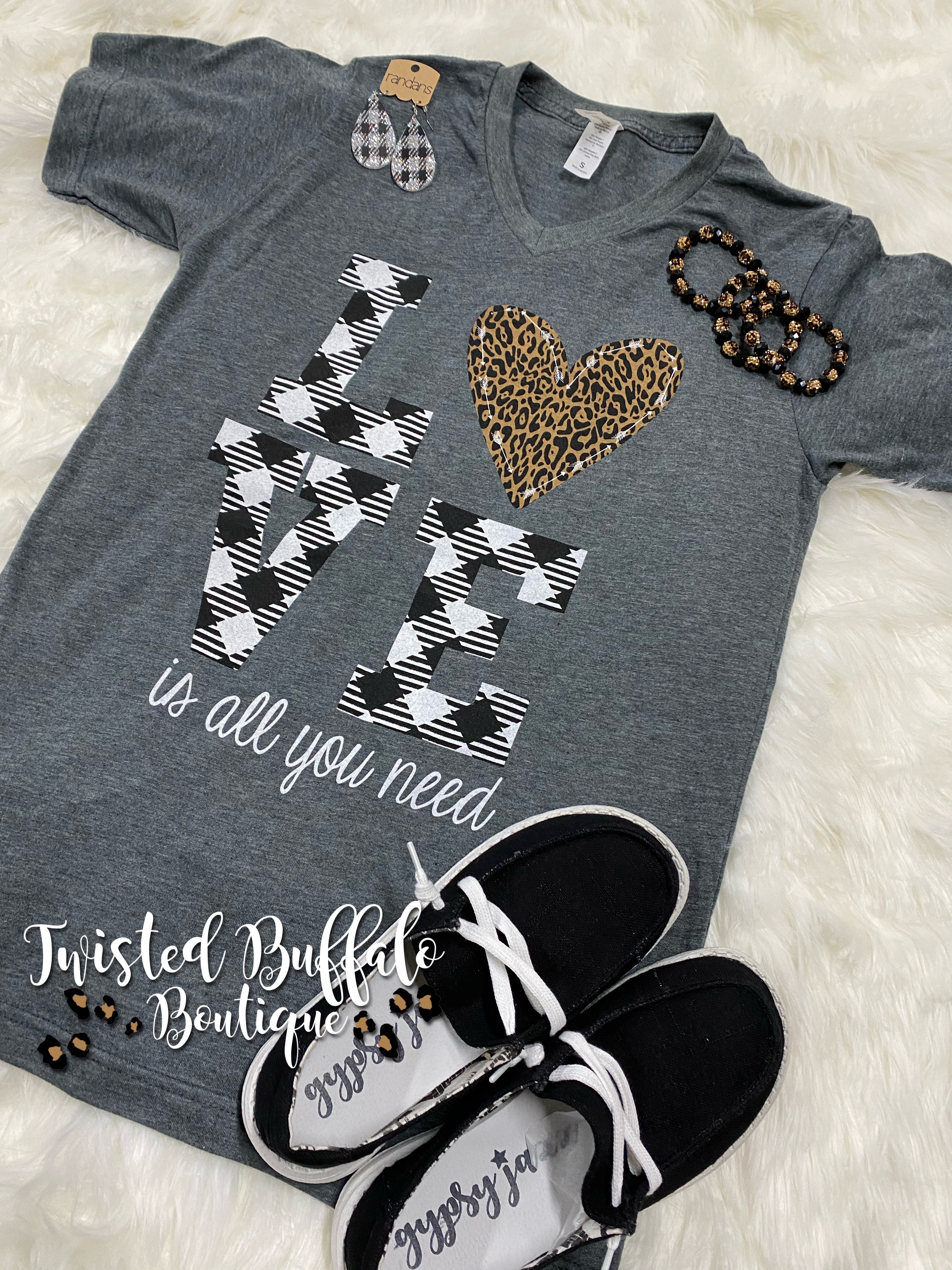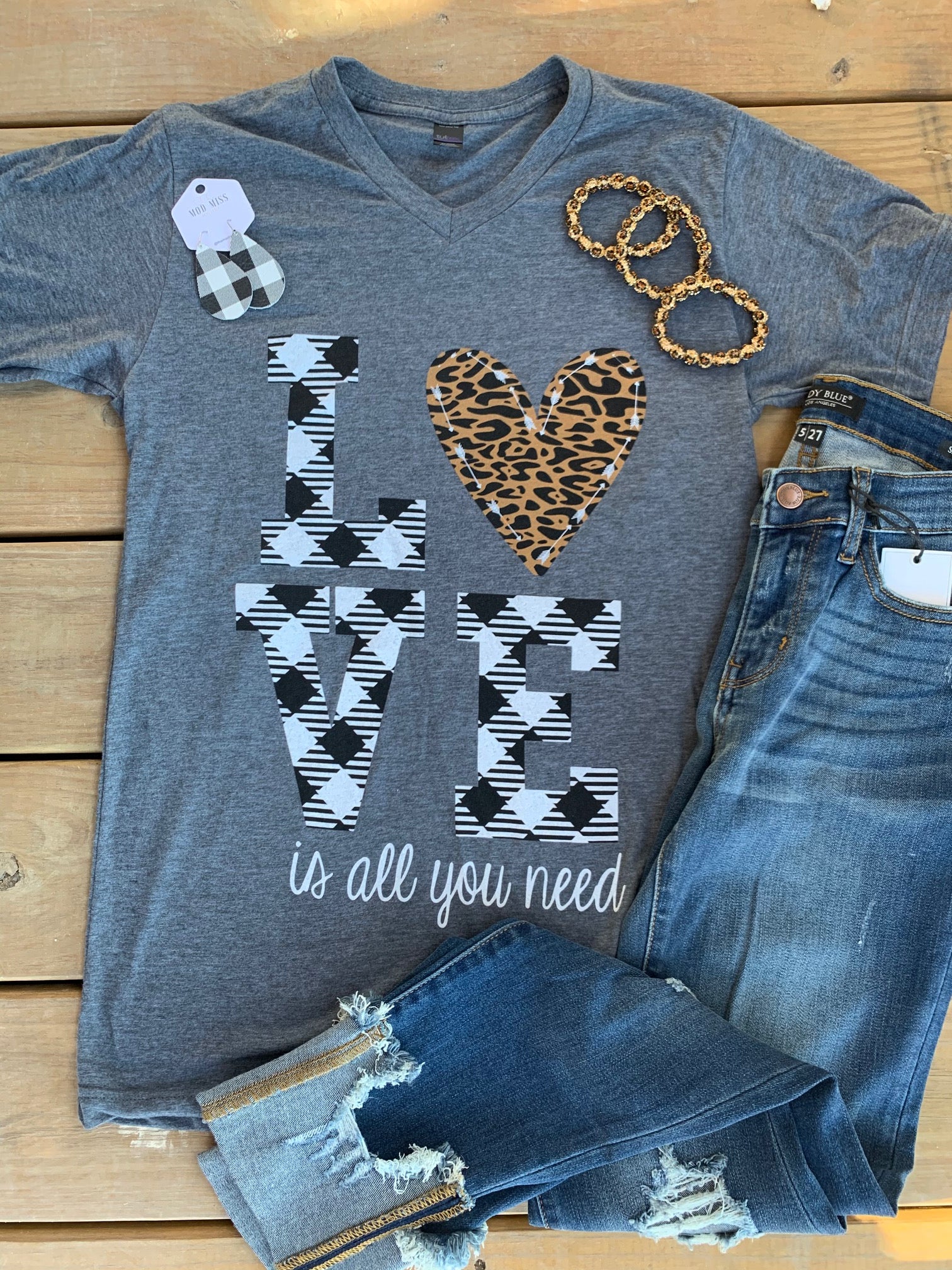 GRAY {LOVE IS ALL YOU NEED} Leopard + Plaid Charcoal Gray V-Neck Tee - S is backordered and will ship as soon as it is back in stock.