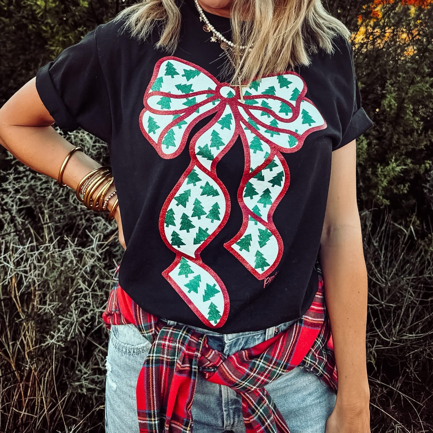 (RIBBONS & BOWS} Glitter Bow/Tiny Trees Black Crew Neck Tee - 2X is backordered and will ship as soon as it is back in stock.
