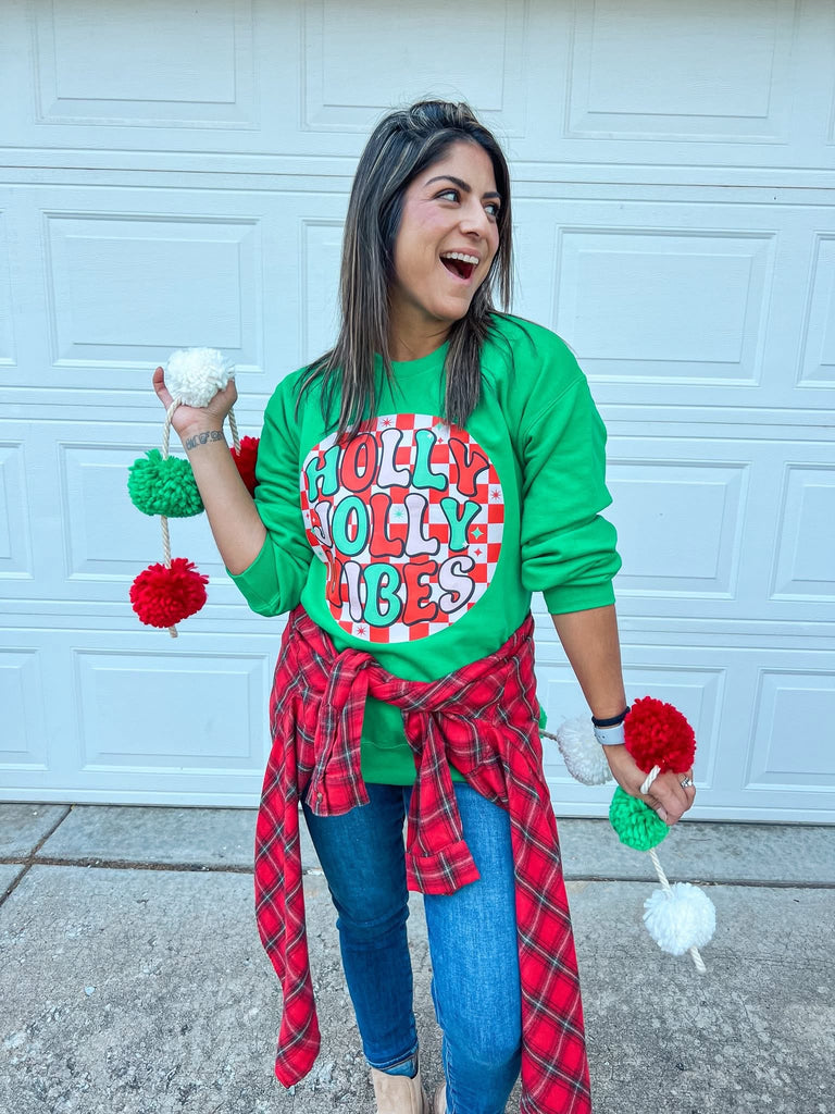 Green Sweatshirt {CHECKERED HOLLY JOLLY VIBES} Crew Neck Sweatshirt